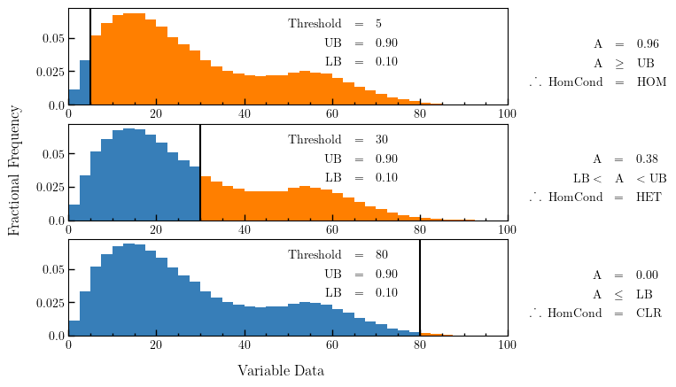 In the figure below, a graphical representation of the splitting decision making process is shown. In this, the blue histogram represents an arbitrary dataset, the orange histogram represents the values in the dataset that are greater than the threshold (and denoted 'A' in the formulae), the black line is the threshold value, 'UB' is the upper bound, and 'LB' is the lower bound. To be specific, this is a probability distribution, and hence the area under the orange curve 'A' is a decimal fraction of the total dataset (which would have an area of 1).