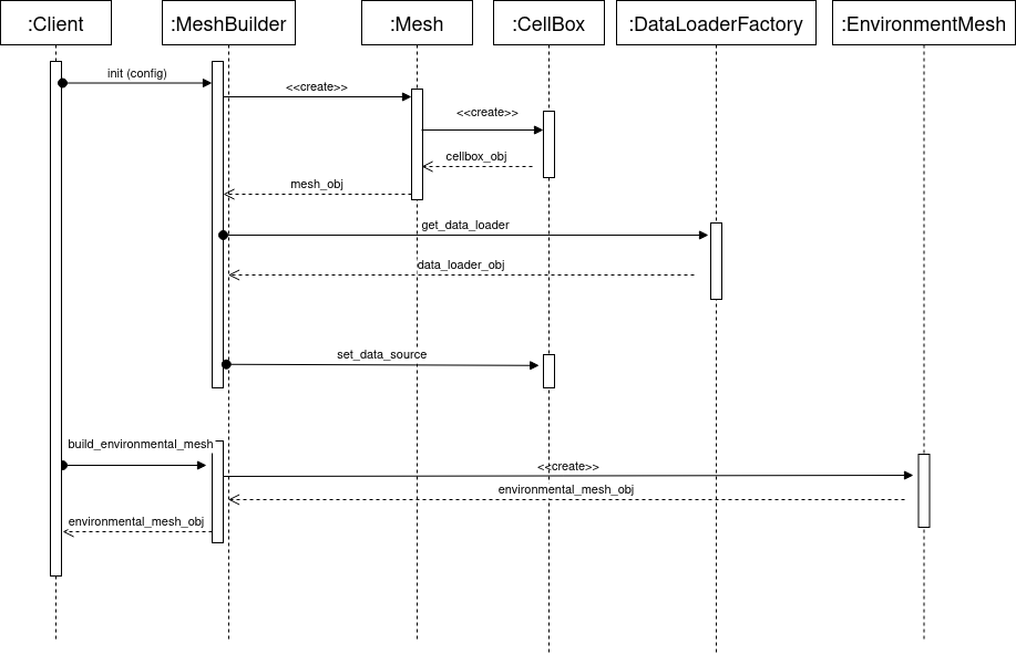 This sequence diagram illustrates a use case for the Discrete Meshing of the environment, where the module's client starts by initializing the MeshBuilder with a certain mesh configuration (see Input-Configuration section for more details about the configuration format) then calls build_environment_mesh method.