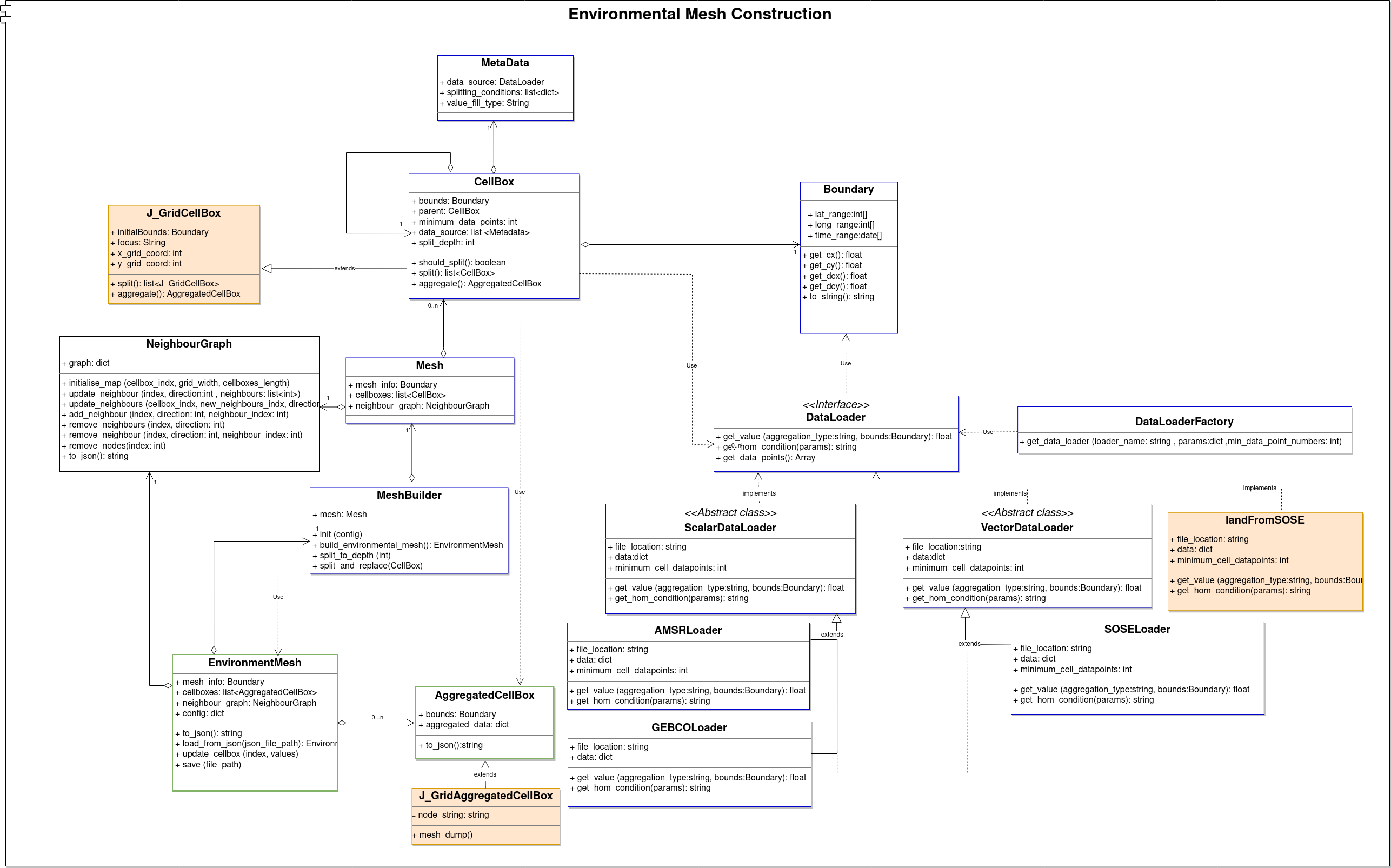 The below UML diagram describes how the Environment Mesh Construction module is designed. It depicts the classes of the module and how they interact with each other.